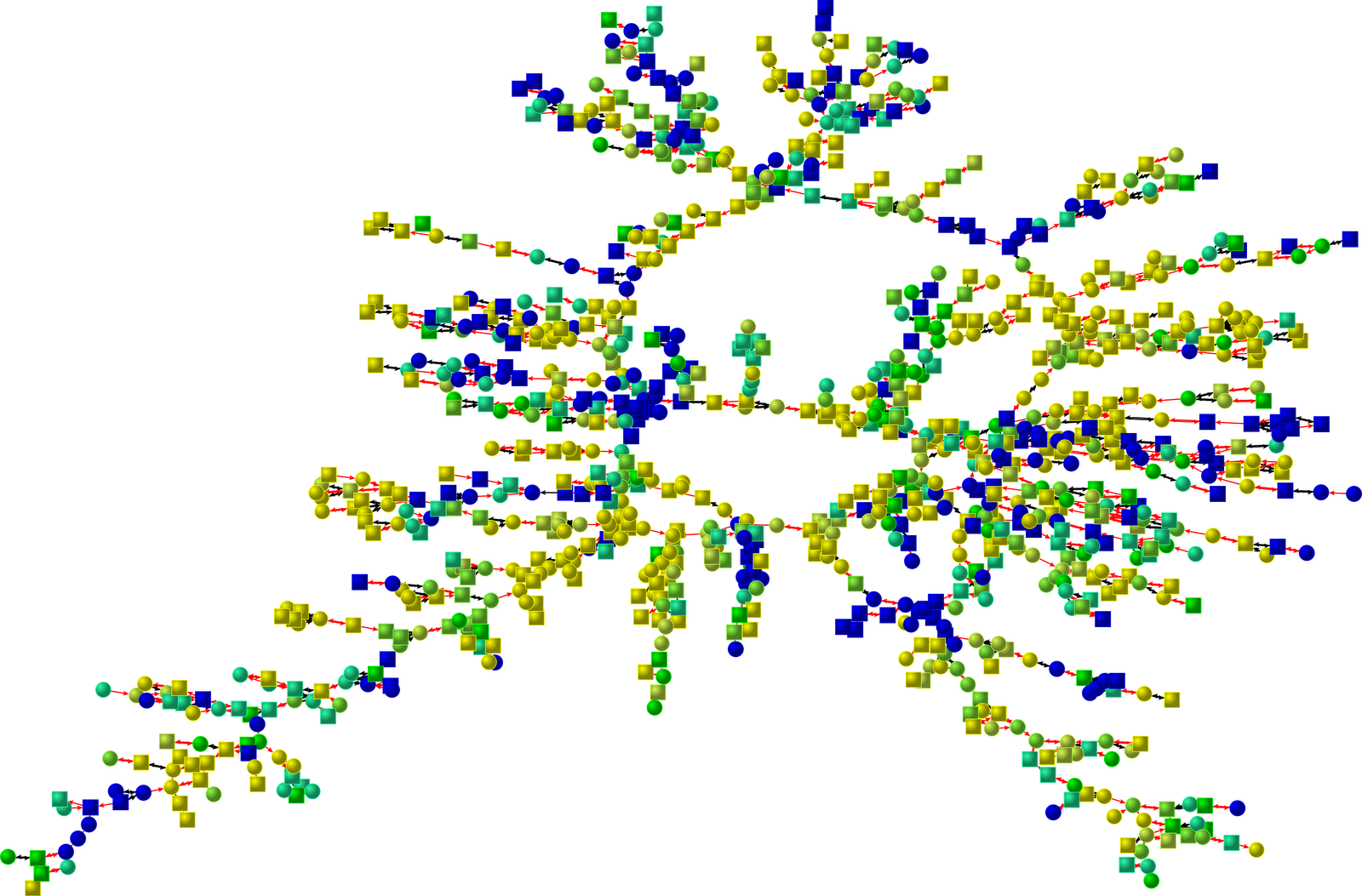 Happiness is contagious say researchers Nicholas Christakis and James Fowler, author of “Connected: The Surprising Power of Our Social Networks and How They Shape Our Lives.” In a scientific survey they analyzed a network of relationships. In the diagram, happy is yellow, sad is blue, and green is, you guessed it, in between. They found that happiness always spreads from person to person, whereas unhappiness only sometimes spreads between persons.