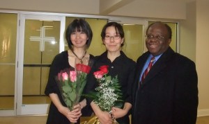 I just heard the most amazing concert, played by pianist Akiko Hosaki (on left), and handbell soloist Hyosang Park (center) to benefit United Front Against Riverblindness, headed by Daniel Shungu, shown on right. It was at St. Paul’s Lutheran Church, a beautiful contemporary church in East Windsor.