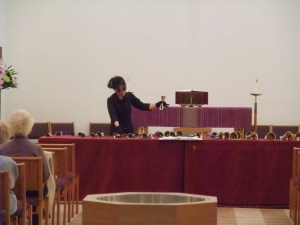 Park and Hosaki collaborated on Lenten hymns, using rubato (pauses, ever-so-slightly varying tempos) that twanged the heartstrings. Some were their own arrangements (solo handbell is so difficult that it can be hard to find good ones, they say). Especially wonderful were their arrangements for Jules Massenet’s “Thais,” Vivaldi’s “Winter,” and my absolute favorite, Erik Satie’s “Gymnopedie” #1. Especially in the Satie, the bells seemed to crescendo and decrescendo on the same note. The telecommunications engineer/musician who was sitting with me informed me that this was the Doppler effect, that if the sound-producer is moving, it makes a different sound. (Did I get that right, John MacDonald?).