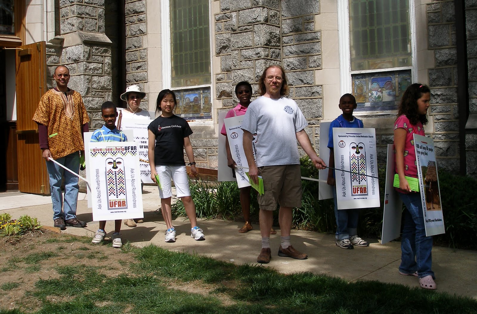 of Communiversity today, leading adults with sticks, wearing sandwich boards, and handing out United Front Against Riverblindness material with slogans like “Just $10 saves six people from going blind” and “