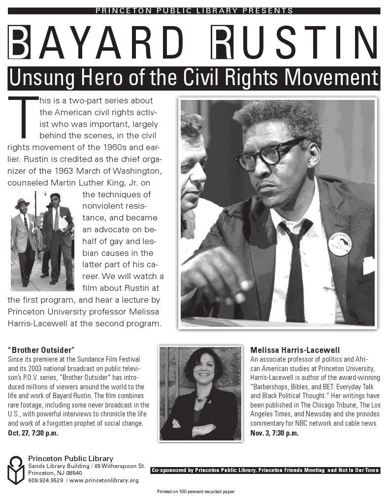 The series on Rustin is co-sponsored by Princeton Friends Meeting and Not in Our Town (NIOT).