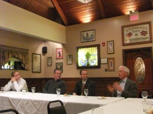 After a stint of Bible study at my church (did you know that Adam and Eve had a 3rd son named Seth?), and a failed interview (my source couldn’t take my scheduled call), I went to Charlie Brown’s for the Einstein’s Alley Entrepreneurs Collective, a group of techie entrepreneurs. Eric Kutner had enlisted a most intriguing panel of sports entrepreneurs (top, from left, Tony Caruso, (sports & entertainment attorney), Howard Moses (Blue Star Jets), John Romanowich (SightLogix), and Sam McCleery (formerly with Prince and now Princeton Video Image.) Second photo is Mark Silverman, ex of Ernst & Young, and Romanowich. For more photos (Moses, Kutner, and McCleery and the EA organizers, Steven Georges and Marion Reinson of To the Point Communication try this link.