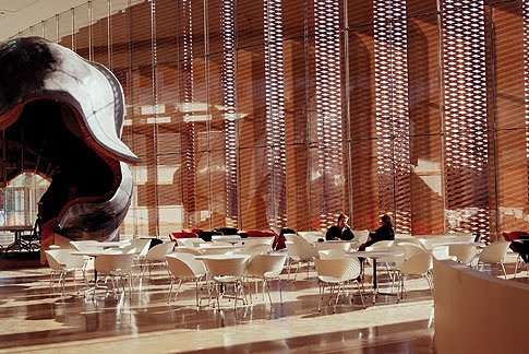 Set within the inspired and soaring spaces of the Carl Icahn Laboratory atrium (designed by Rafael Vinoly, pictured above), Flock Logic unfolds on multiple levels – with the movement action set at ground level and all the vantage points located above. It is accompanied by a small combo with synthesizer generating appropriately atmospheric music.