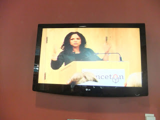 Melissa Harris-Perrydoesn’t like the book or movie “The Help,” and that’s an understatement. It wasn’t the topic of her talk at the Princeton Public Library today, but somebody asked that question and set her off on one of her always provocative, often funny, riffs on racial politics. She returned to Princeton today (October16, as shown on the screen in the lobby) to talk about and sign her book, “SisterCitizen: For Colored Girls Who’ve Considered Politics When Being Strong Isn’t Enough.”