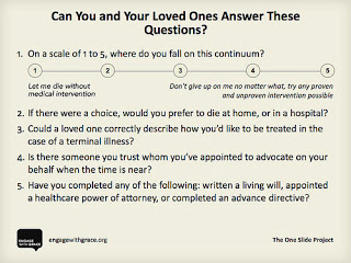 Another favorite holiday tradition — you may say it is at the other end of the spectrum, but it depends on your world view — is the “Engage with Grace” movement, which aims to help family members let each other know about their end-of-life preferences at an early time, when the discussion is not so painful. Deciding whether your spouse wants to be resuscitated is not a discussion you want to have when you are signing into a hospital, nor do you want to have this conversation with your siblings on your cell phone. So the Engage with Grace folks suggest you use the “one slide” approach. This slide, to the left, offers 5 not-so-easy questions. This year’s variation on Engage with Grace is Occupy with Grace. Don’t reject it out of hand. It’s going to be a lot easier to ask these questions when you are basking in the music of Tchaikovsky or in the tastes of pumpkin pie.