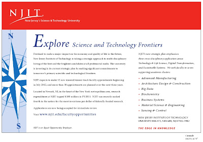 Judith Shift, associate vice president for technology at NJIT, writes to say that is currently looking to hire 12 new tenure /tenure track faculty appointments across the disciplines, including advanced manufacturing, architecture design & construction, “Big Data,” biochemistry, business systems, material science & engineering, and sensing and control. Pass it on!