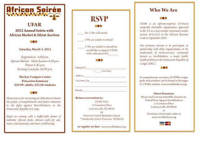 Call Princeton United Methodist Church at 609-924-2613 for information on the African Soiree or register for the African Soiree at http://www.riverblindness.org.