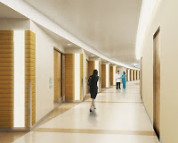 1. Natural light everywhere. All the patient rooms have it. And when you are on a gurney, you aren’t looking up at fluorescent lights in the ceiling. Hallway lighting is vertical, as at left, emanating from slabs outside the patient rooms, so you can be comfortable when you are horizontal.