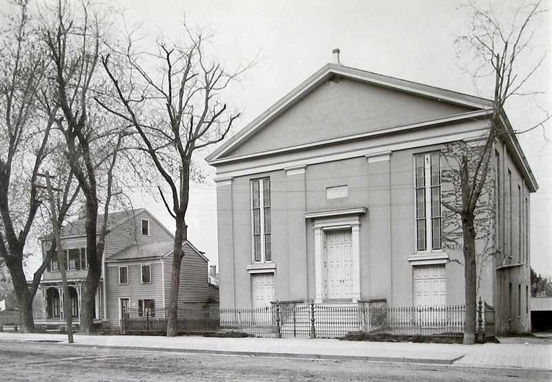 We used to think that the window was “a reject from West Point Cadet Chapel.” That would have made sense. West Point likes war pictures and the two sanctuaries were built at the same time. But no. The real story is that a Princeton University college student, Eddie Durrell, a Methodist preacher’s son, made PUMC his church home in the late 1880s, when the church looked like the picture to the left. The pulpit was occupied by Charles H. McAnney, “an evangelistic preacher of great power,” according to Ruth Woodward in A Journey of Faith for One Hundred Fifty Years: A History of Princeton United Methodist Church. Eddie graduated in 1889 and two years later met an untimely death — apparently in an automobile accident in Italy. His family — grateful for what the church had offered him — donated the window for the new sanctuary, built in 1910 on the property occupied by the old church and the house shown in the picture.