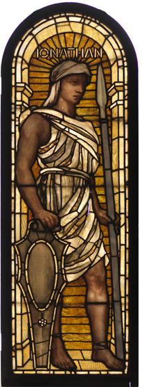 Wrote Ruth Woodward: The magnificent window in the facade of the sanctuary, depicting St. George and the dragon, was the gift of the Reverend Edward Hicks Durrell and his family, in memory of a deceased son and brother, William Edward Durrell, who was a Princeton graduate of 1889. Eddie Durrell died in Italy in 1891 and was buried in the Protestant Cemetery in Rome. Because he was the youngest member of his class, and the first to die, his classmates arranged for a flat marble slab to be erected on his grave as an expression of their love and esteem. The family was probably happy to have an opportunity to provide a memorial of their own.This window was crafted by the Tiffany Studio of New York City, and the Tiffany signature can be found in the lower right corner.