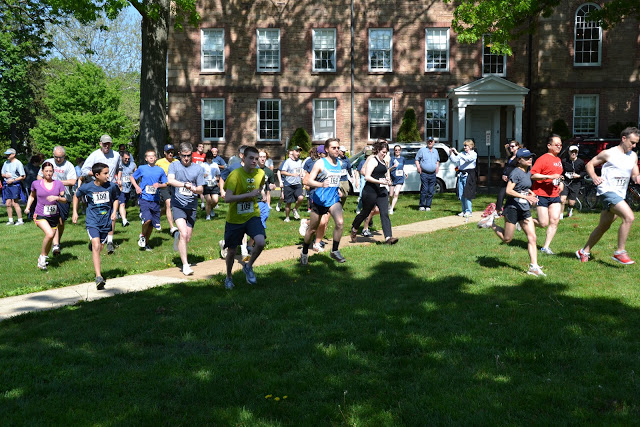 It is such a pleasant path for a 5k run (or, in my case, a 5k walk)! Starting at the seminary, downhill past Springdale Golf Course, along the shaded trail through part of the fabled Institute Woods, where Einstein strolled, past the Institute for Advanced Study, then threading your way through the sycamore-lined streets of some of Princeton’s most impressive homes — and uphill (alas) to the seminary’s wide expansive lawn where cheering crowds await. Even for those who walk — and take an hour to get there — some are there to cheer and record the time. The three fastest runners, male and female, get prizes — and everyone gets a fabulous T-shirt.