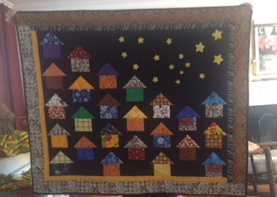 IT TAKES A VILLAGE . . . TO ERADICATE RIVERBLINDNESS, quilted wall hanging by Sally Ross of Princeton United Methodist Church. Against the background of the dark night sky, gold stars twinkle over 24 huts of an African village. “The title refers to the ‘villages’ both in the DRC and around the globe working to eradicate this disease,” says Sally. Adapted from a pattern by Kitambaa Designs; some of the fabrics came from Africa, and all the materials are 100 percent cotton.