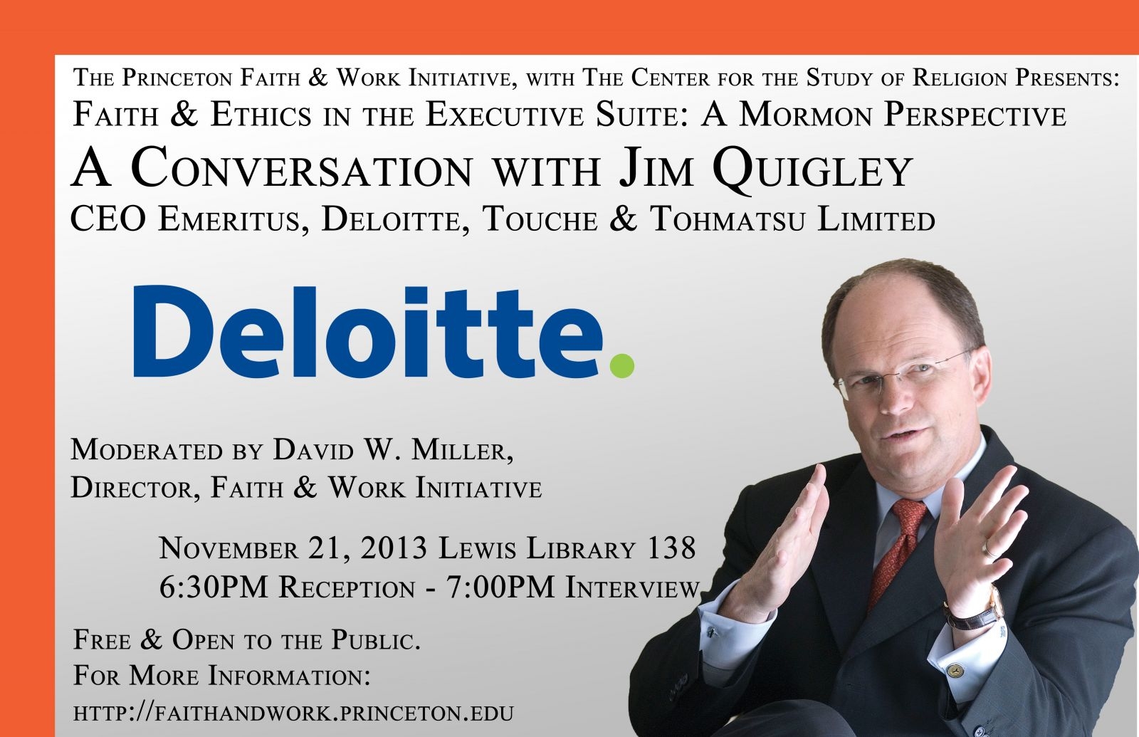 A Mormon in the corner office: Here is a press release about a free event sponsored by the Princeton University Faith & Work Initiative — a conversation with Jim Quigley, CEO Emeritus, Deloitte, Touche & Tohmatsu Limited, on November 21, 2013 at 7:00 pm, on the Princeton University campus in Lewis Library 138 (the modern building, near the intersection of Ivy Lane and Washington Road in Princeton). The event will be preceded by a reception from 6:30 – 7:00 pm.
