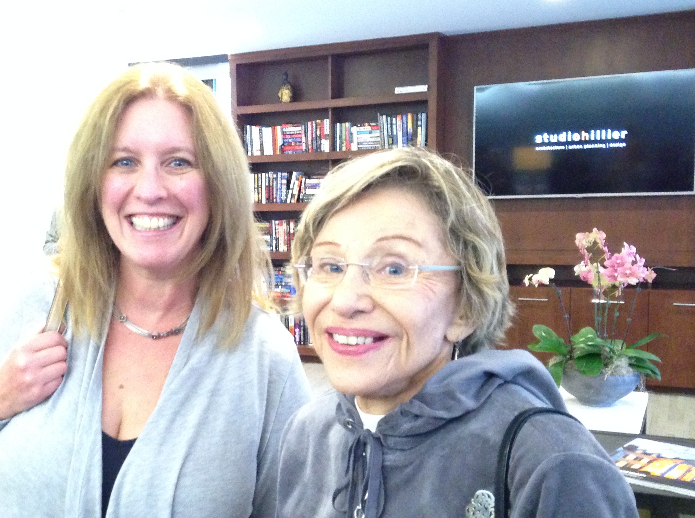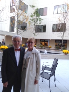 You’ll find much better photos on the website, but here is a cellphone snap of the wall-to-wall view (thanks, Victor Murray, for showing me how to use the panorama on my iPhone). I went with a chamber buddy, 2014 oct marionMarion Reinson (tothepoint.com), shown here with Phyllis Spiegel. Champagne flowed.