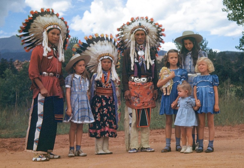 Wearing the cowboy hat from my uncle, I stand next to a Native American girl just my size (I was 8) while my sister stands with our cousins. I’m sure we paid for this photo. Nobody in this photo looks very happy. And no wonder. Sisters in their matching dresses, made by our mothers, and how heavy those feather headresses must have been! My first introduction to Native Americans, at age 3.