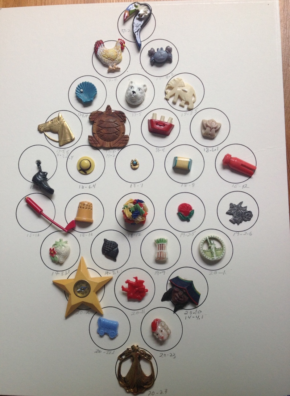 One of the categories for this show is enamel buttons, as on the left. Below, a card of buttons that are are actually in the shape of what they depict: bird, rooster, crab, bear, elephant, flower, thimble, etc.